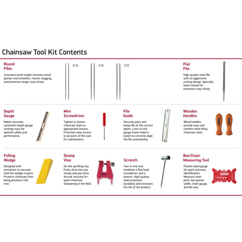 Découvrez le kit d'outils pour l'entretien de tronçonneuse Oregon, un ensemble complet pensé pour maintenir votre tronçonneuse en parfait état. Conçu pour les professionnels comme pour les amateurs, ce kit vous permettra d’effectuer toutes les tâches d'entretien nécessaires avec des outils de qualité.