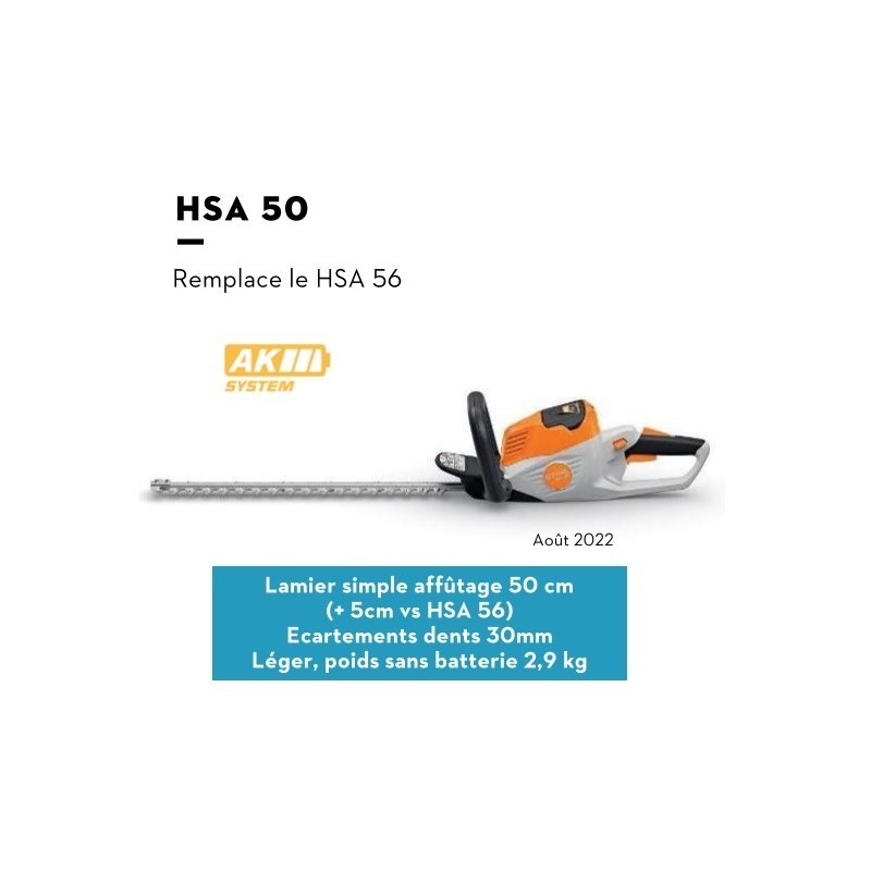 N'oubliez pas de sauvegarder votre personnalisation pour pouvoir l'ajouter au panierLe taille-haie sans fil STIHL HSA 50 est un outil polyvalent conçu pour l'entretien efficace des haies et des buissons. Son fonctionnement silencieux le rend idéal pour une utilisation dans des zones sensibles au bruit, vous permettant de travailler en toute tranquillité tout en garantissant des performances optimales.